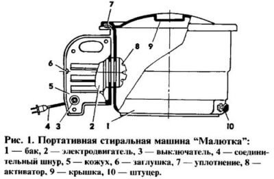 Класическият SM "Malyutka" включва резервоар за пране, вътре в който е монтиран активиращ диск с остриета. Когато дискът се върти, водата се смесва с перилни препарати и заредено пране. Така процесът на измиване се извършва в "Малютка". Дискът на активатора се задвижва от електродвигател, управляван от обикновен таймер под формата на обикновено реле за време.